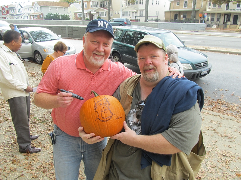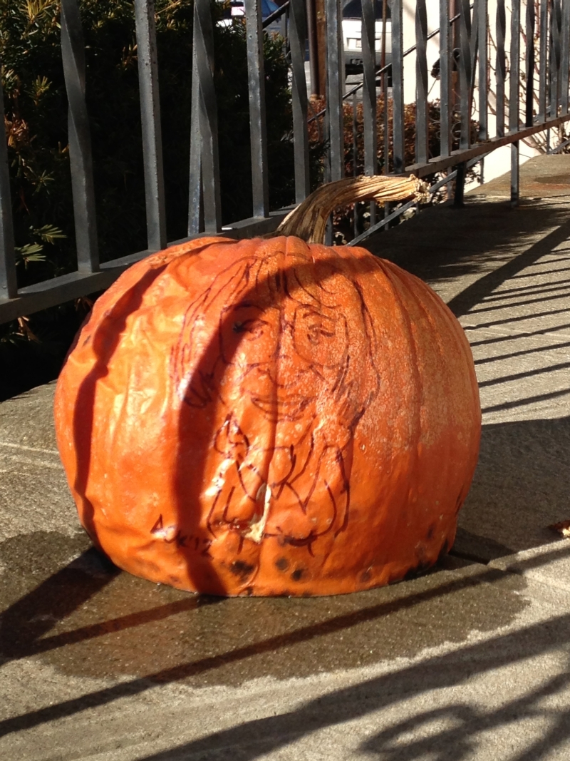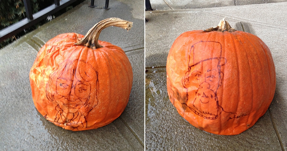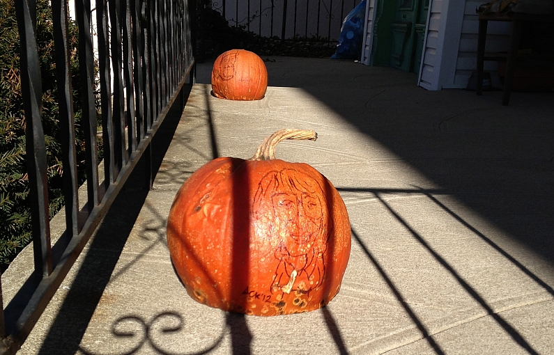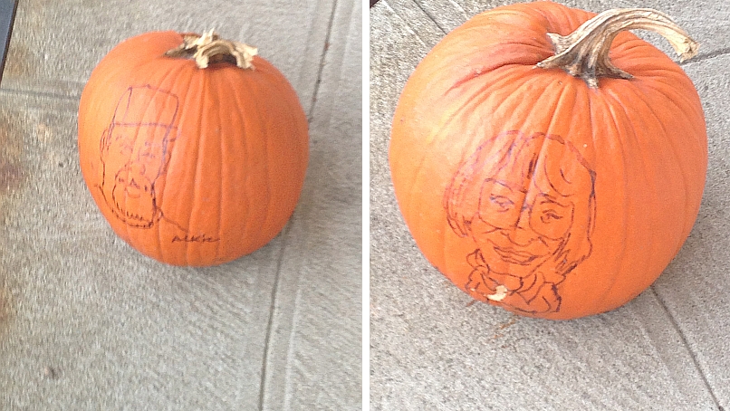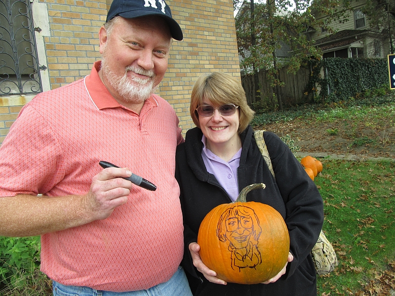 Back in October we went to the Blessing of the Pets at Emanuel United Church of Christ. There we met an old friend and artist Artie Ackermann and he drew our pictures on two pumpkins --